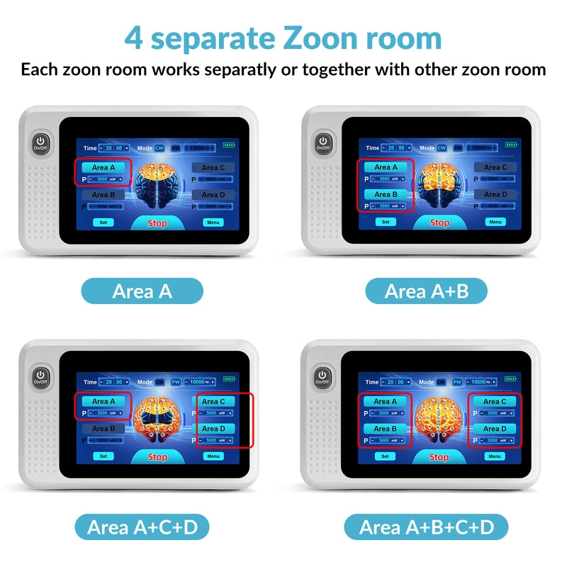 2. Flexible Zone Control Combination: Features 4 independent zones (Area A, B, C, D). Each zone can operate independently or combine with others—such as Area A single-zone or Area A+B dual-zone configurations—enabling differentiated multi-area therapy.