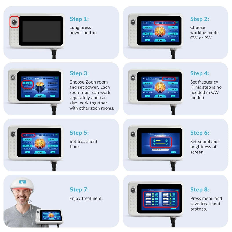 For optimal results, set the helmet to Pulse Wave (PW) mode and adjust the frequency and power according to your needs. The recommended regimen is six sessions per week, each lasting 20-30 minutes, maintained consistently for 8 to 12 weeks.