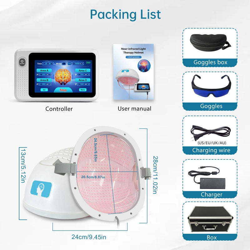 • CUSTOMIZABLE MODES – SAFE & EASY TO USE: The near-infrared phototherapy helmet features a fully customizable design, delivering a professional-grade experience tailored to each user's individual needs and health goals. The device precisely regulates light intensity, frequency, and duration to ensure optimal efficacy while prioritizing maximum comfort and safety. The helmet supports both continuous and pulsed light modes, with pulsed frequencies flexibly adjustable between 1Hz and 10,000Hz. Single-session duration can be customized from 1 to 60 minutes. Volume control and screen brightness adjustment further enhance usability and user experience. It also features 4 separate Zoon room and ten preset protocols, providing versatile experimental support for diverse studies related to neurological and cognitive functions.